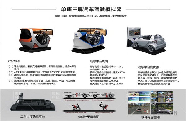 簡介:多自由度動感駕駛模擬器,三屏單座全動感汽車模擬器采用2自由度電動缸動感平臺,單座三屏模擬器為我司自主研發(fā)的動態(tài)賽車及汽車模擬器,是一個固定基座搭載可移動的平臺以及駕駛者